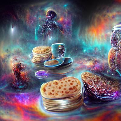 This image shows a vibrant, psychedelic illustration of food, tea, and crumpets. The artwork features holographic and astral elements, rendered as mixed media.