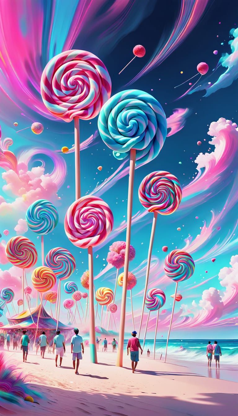 A vibrant image shows people celebrating a summer festival on a beach. Swirling nebula clouds and glowing lollipops create a psychedelic and dreamlike atmosphere. Rendered as colorful digital art.