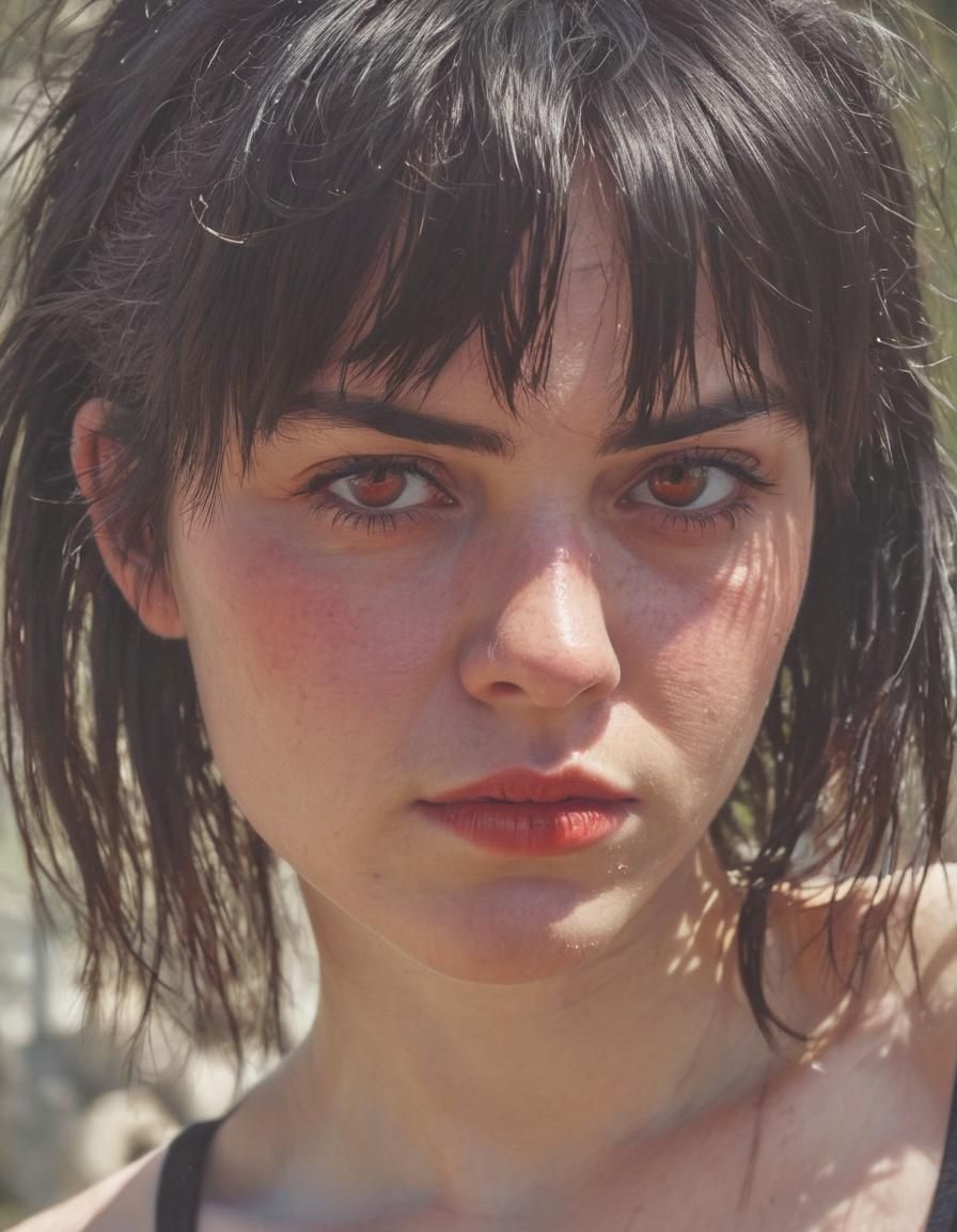 A close-up image of a person with sunburned skin, a scowling expression, and a mullet hairstyle. The subject's amber eyes squint in the harsh sunlight, conveying intense discomfort.