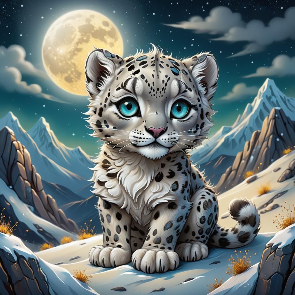 This whimsical digital painting features a snow leopard cub with glowing eyes in a dark fantasy dreamscape. Vibrant colors and dramatic lighting create an ethereal, high-contrast atmosphere.