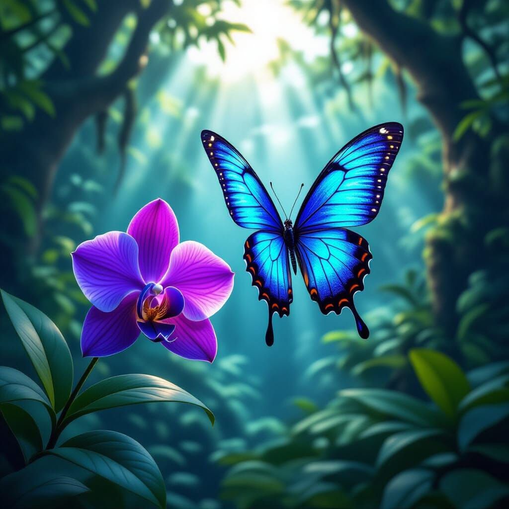A vibrant image of a deep purple orchid with iridescent blue butterfly wings soaring through a lush rainforest. Sunlight catches the wings in this detailed fantasy concept art.