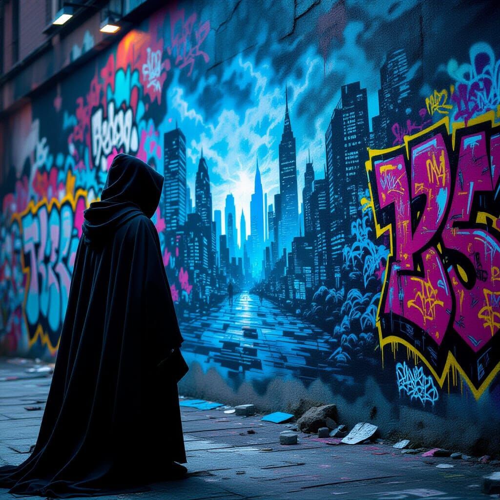 This image shows a cloaked figure silhouetted against a graffiti-covered wall depicting urban decay. This digital artwork is rendered with deep colors and intricate details, reminiscent of dark fantasy realism.