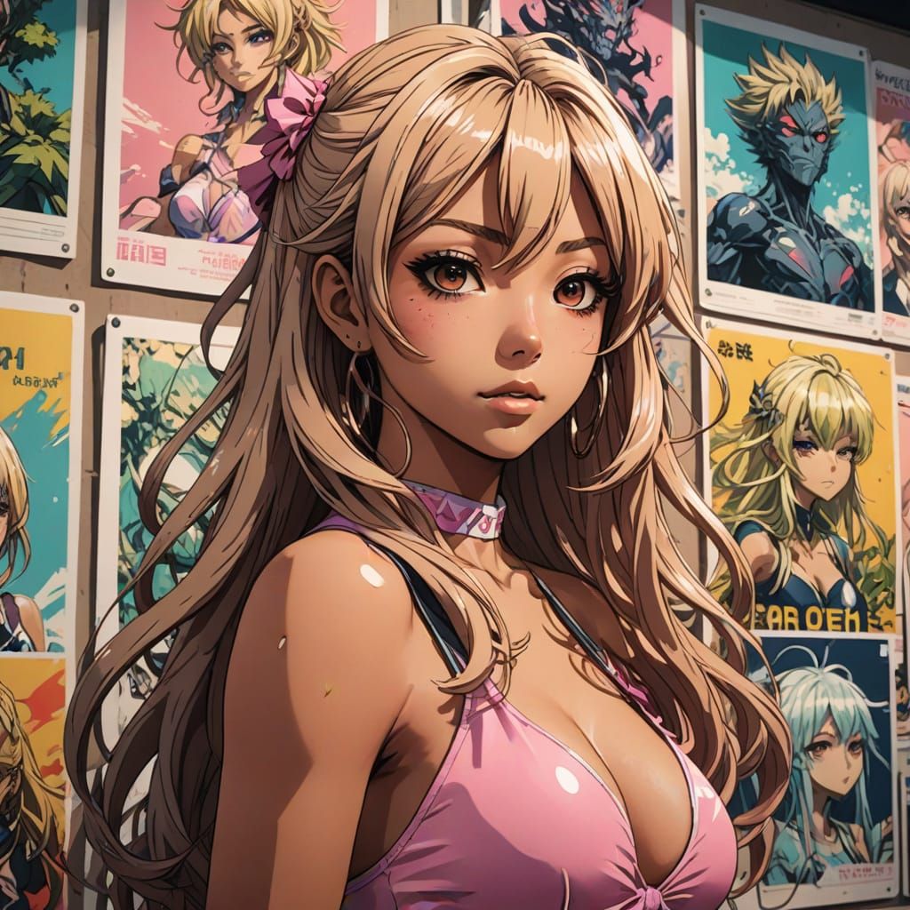 This anime illustration features a gyaru girl with vibrant colors, bold lines, and textures reminiscent of Studio Trigger's style. She stands in front of a wall of old posters, wearing a swimsuit, with gyaru makeup and tanned skin. The image is characterized by soft, warm lighting, deep shadows, and subt...