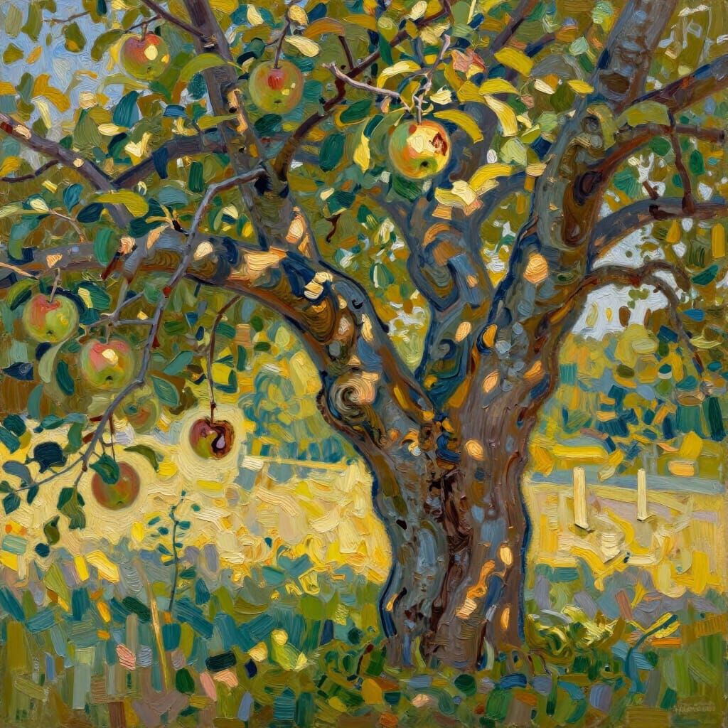 This oil painting captures a rotten apple falling from an old tree on a sunny day. Rendered with thick impasto brushstrokes and vibrant colors, it features a dramatic golden hour light.