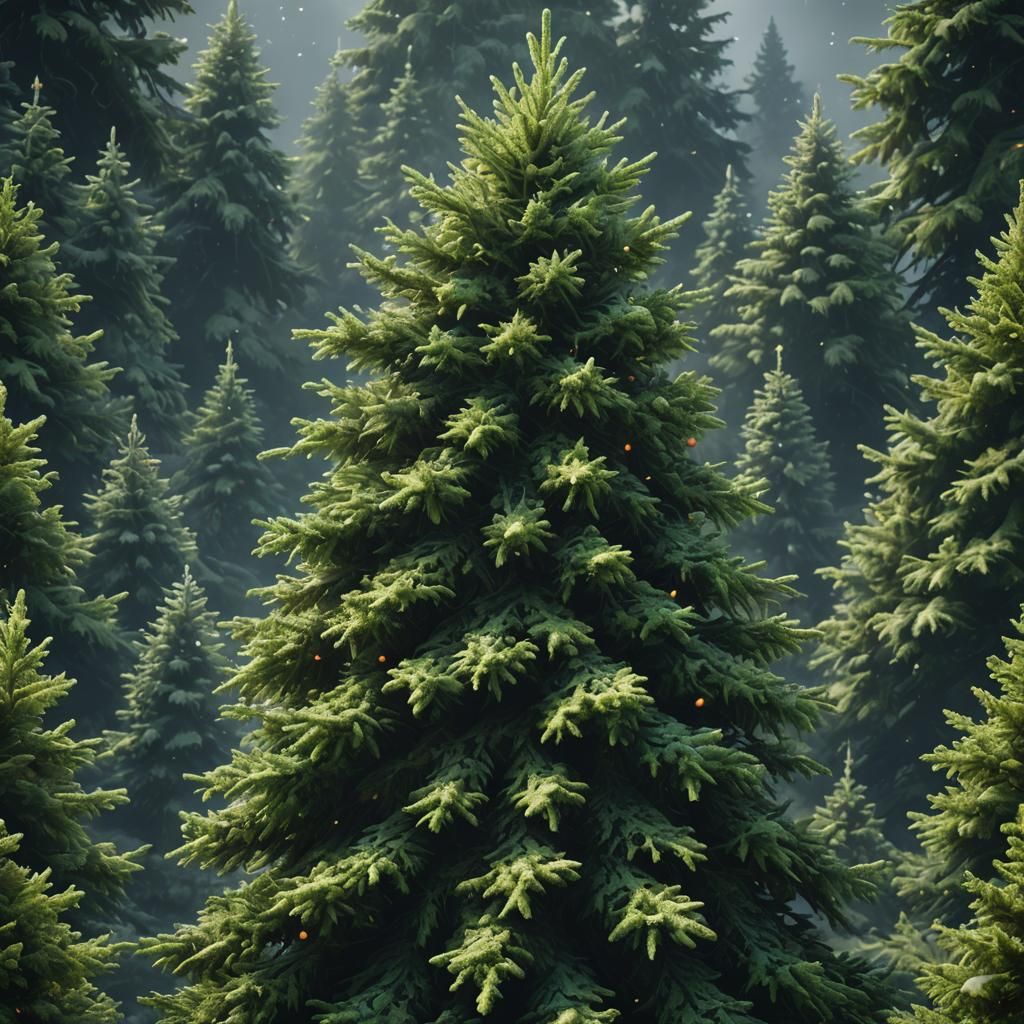 This image shows a lush green Christmas tree. It's a detailed matte painting with deep, complementary colors, reminiscent of fantasy concept art, rendered in 8k resolution.