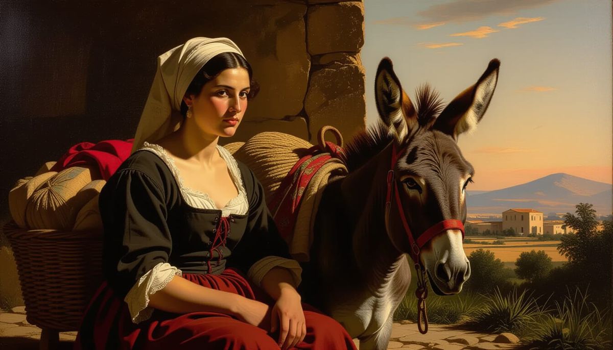 This image depicts a baroque-style painting of a Sicilian woman with her donkey, showcasing dramatic lighting and rich impasto textures. The scene is rendered with deep, saturated colors and atmospheric depth.