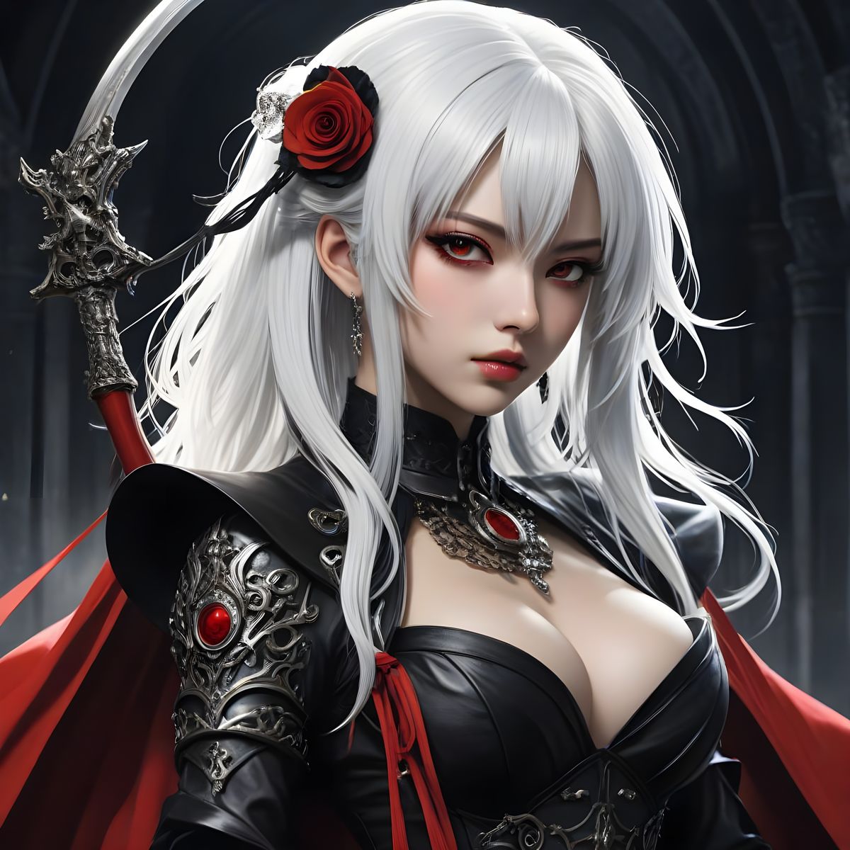 This image features an anime woman in a gothic royal dress, holding a scythe. She has white hair and red eyes, with dramatic lighting creating a dark fantasy atmosphere.