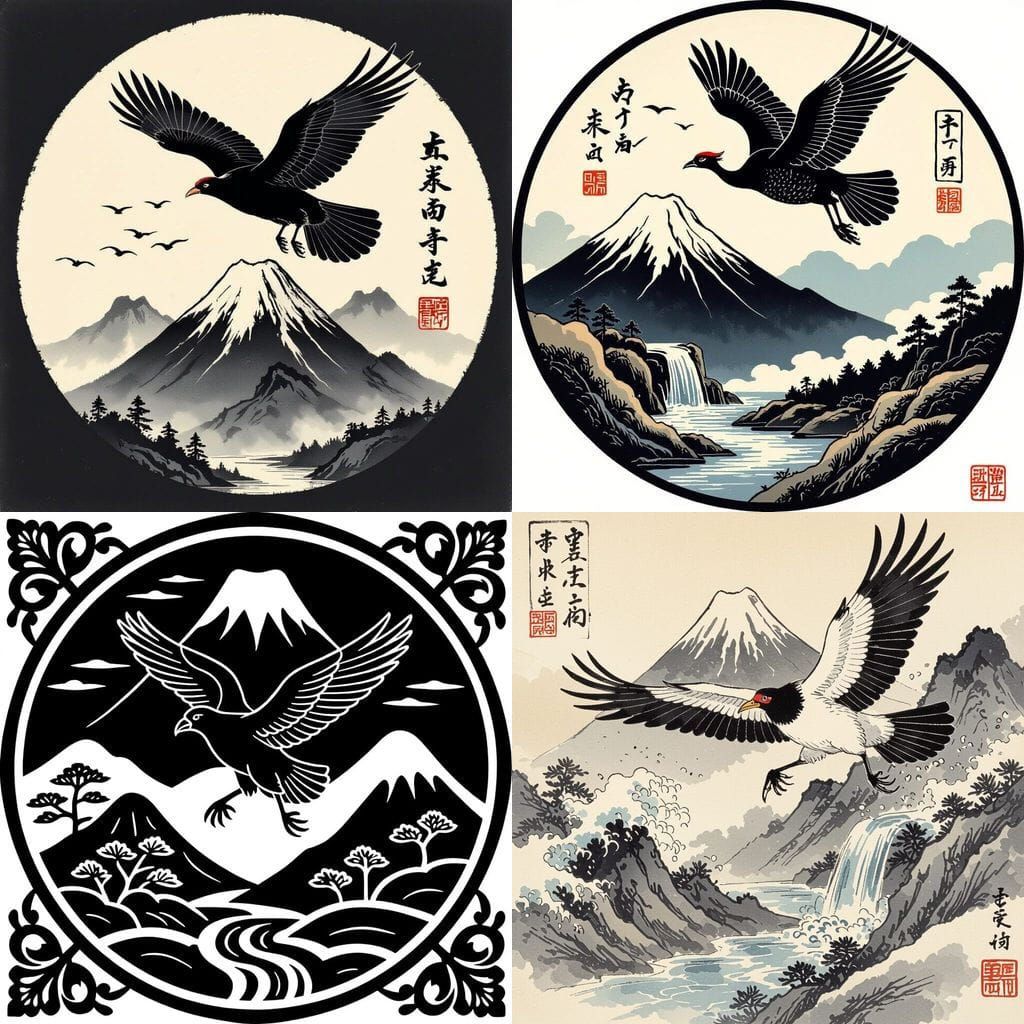 Design your own unique Kamon crests, featuring birds, mountains, and water, using our free and easy AI generator.