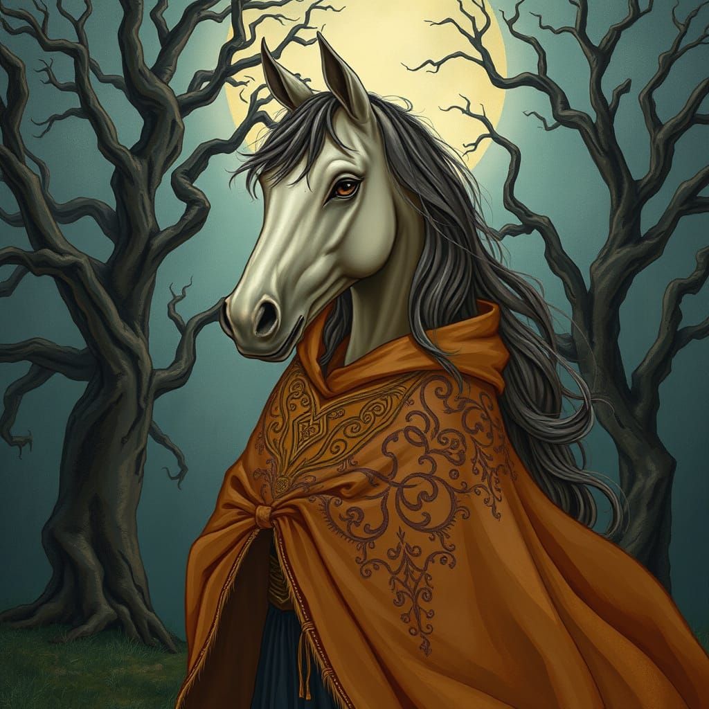 This image depicts a horse-headed woman in a cloak, standing in an ancient forest under moonlight. It features dreamlike illustrations with rich textures and bold, vibrant colors, in a whimsical fantasy style.