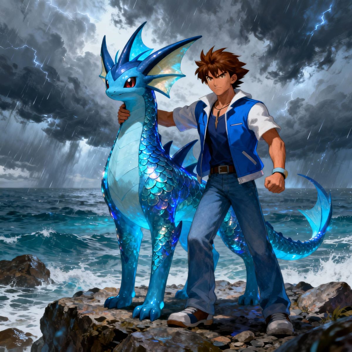This image shows a majestic Vaporeon with its trainer on a rocky coast. They stand together under a stormy sky, rendered in a vibrant fantasy concept art style with dramatic lighting.