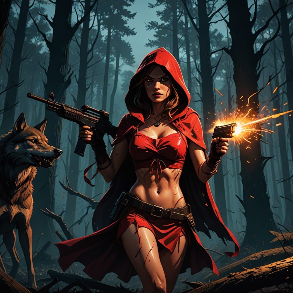 This intense digital art depicts Little Red Riding Hood in a bold, graphic novel style, wielding an assault rifle against a pack of wolves in a dark, eerie forest. Vivid colors and dynamic lighting create a Quentin Tarantino-inspired atmosphere, with a focus on intense action and dark fantasy elements.