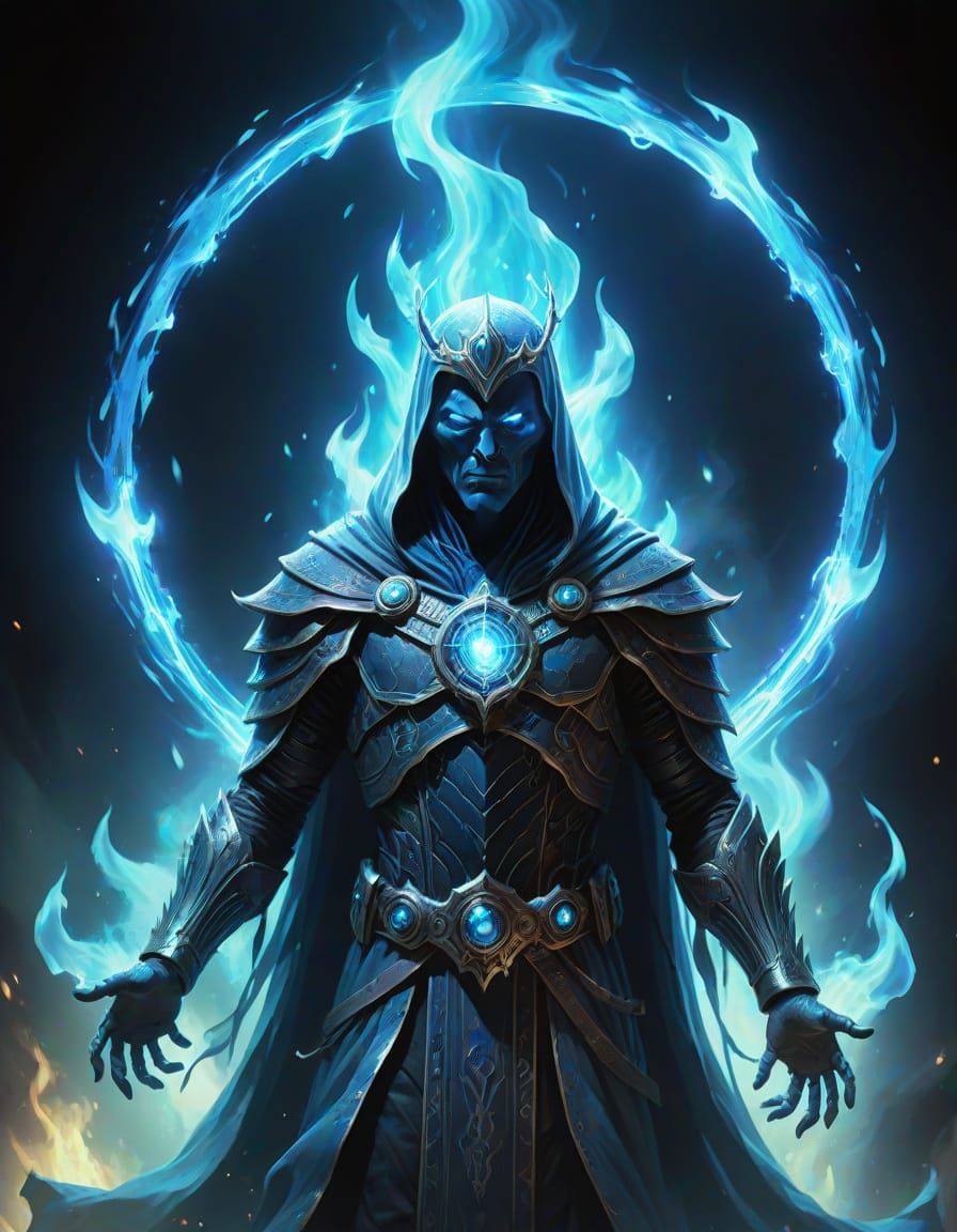 This highly detailed splash art depicts a spectral king within a circle of blue fire, observed by applauding aliens. Features an ethereal glow and dramatic lighting.