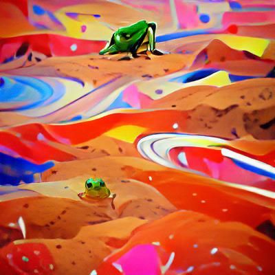 This image depicts a frog sitting on the surface of Mars. The desolate, red landscape of Mars provides a stark contrast to the amphibian.