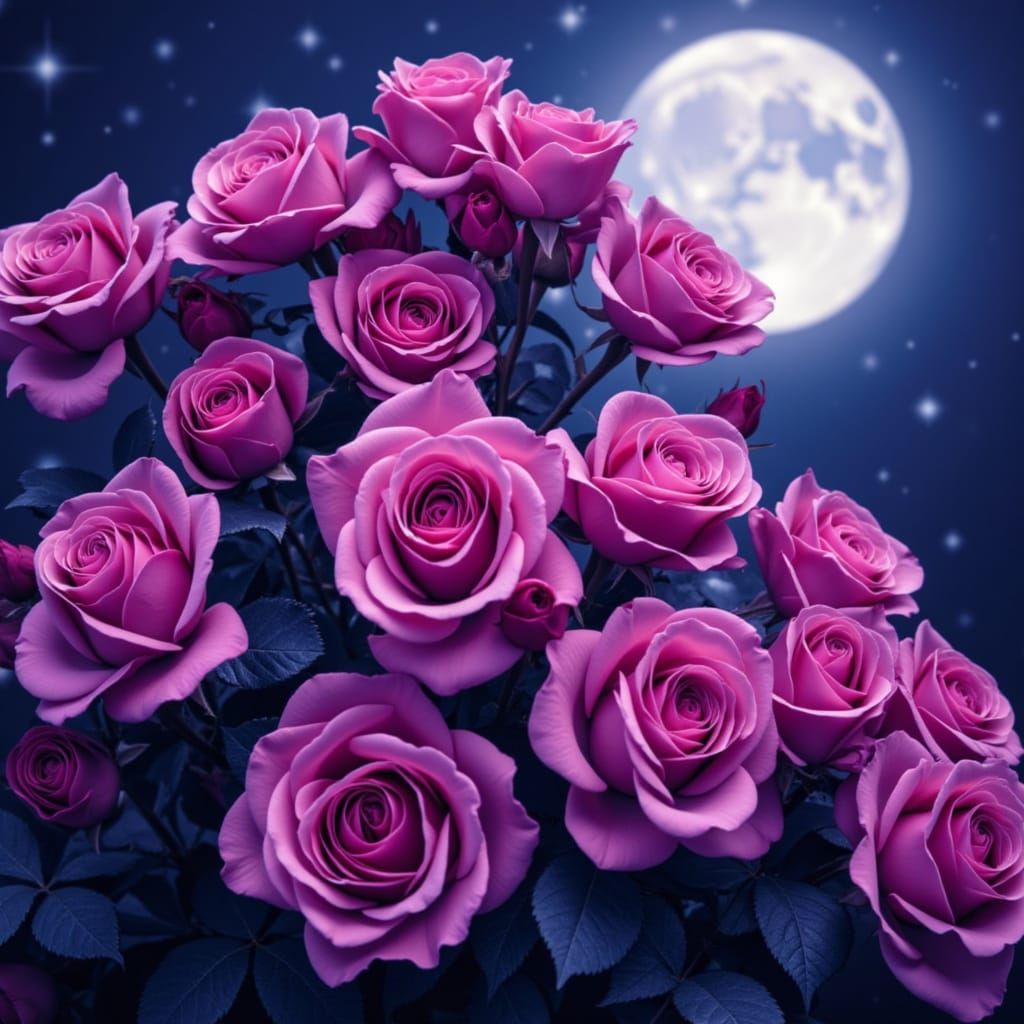 A photorealistic rose bush featuring pink, purple, and indigo gradient-colored roses under a moonlit, starry sky. The image evokes a dreamy, ethereal aesthetic with high contrast rendering.