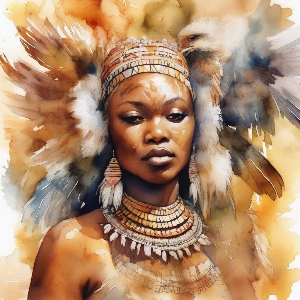 This image shows a close-up watercolor illustration of a tribal African fairy with feathered wings and face paint playing drums in a ritual. The artwork features earthy tones, soft focus, and gentle colors.