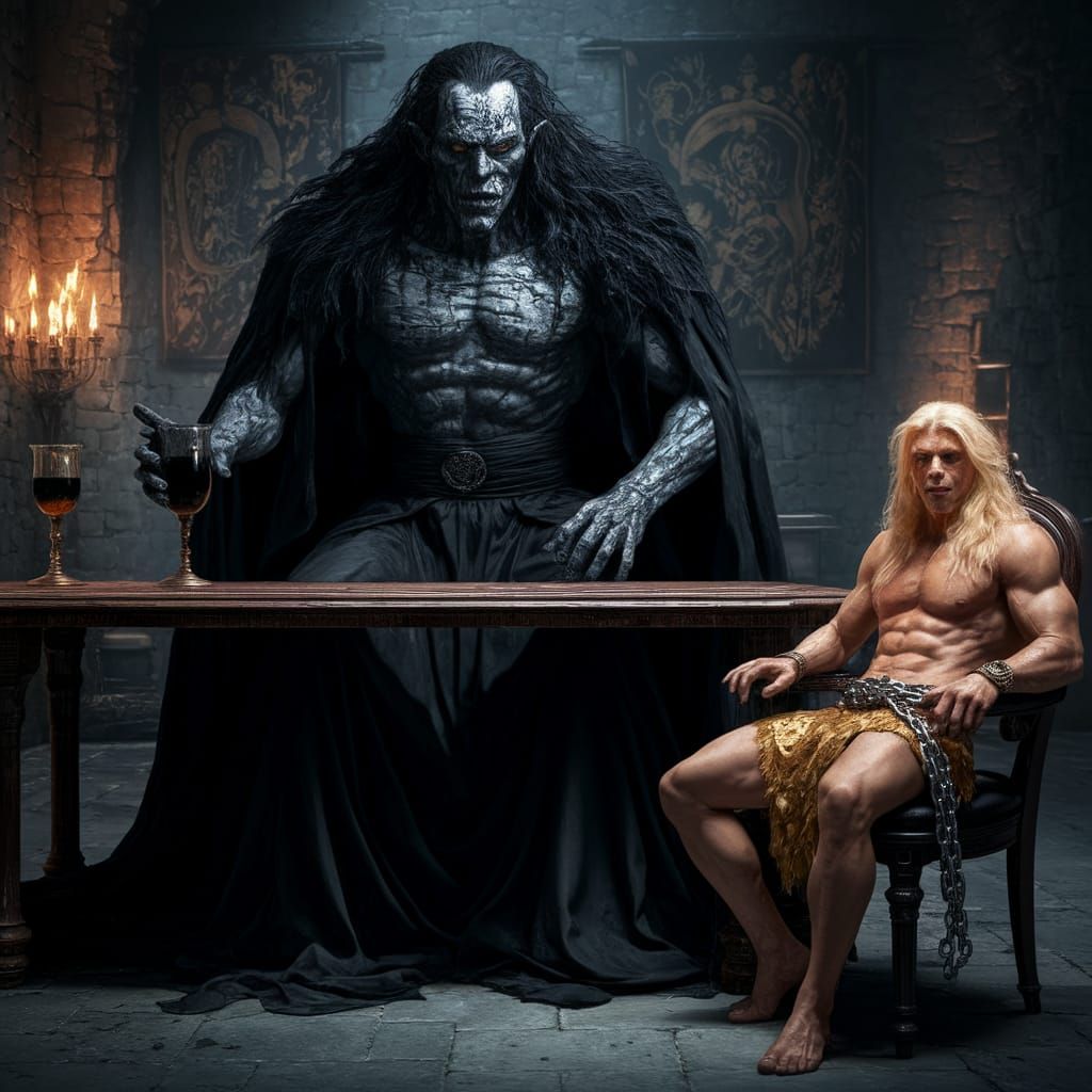 A dark figure sits at a grand wooden table in a dimly lit, ancient castle hall, holding a goblet of mysterious black liquid. Beside him, a chained captive with golden armor glows warmly under flickering torchlight.