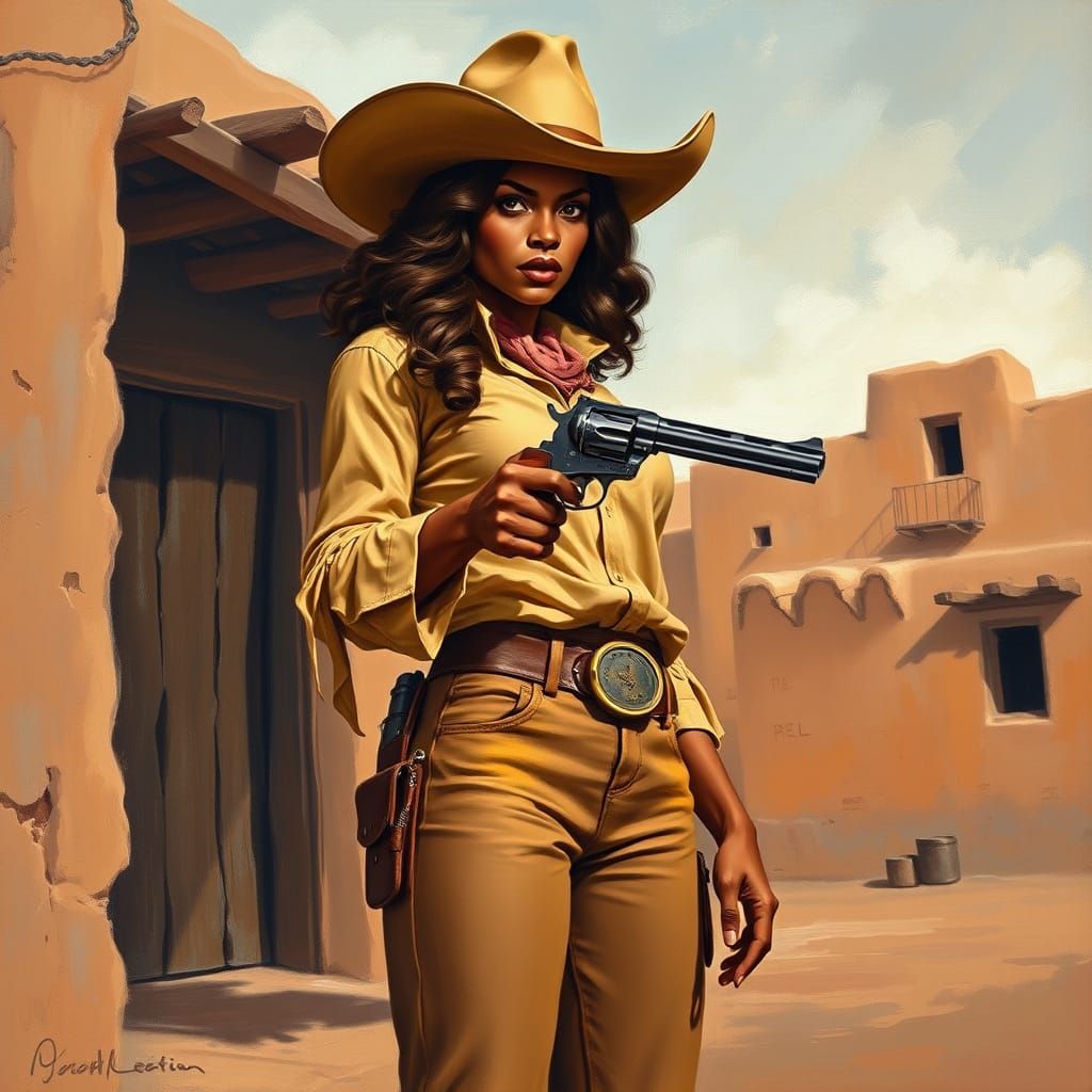 A striking picture of a tall, beautiful African American woman in Western attire, ready for a fight outside a cantina. The image has an abstract, oil painting aesthetic.