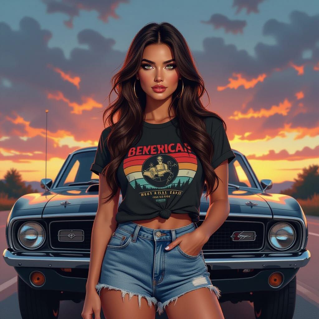 A hyperrealistic image of a woman with long brunette hair and light eyes in front of a classic car. Sunset casts long shadows in this detailed, dramatically lit scene reminiscent of digital art.