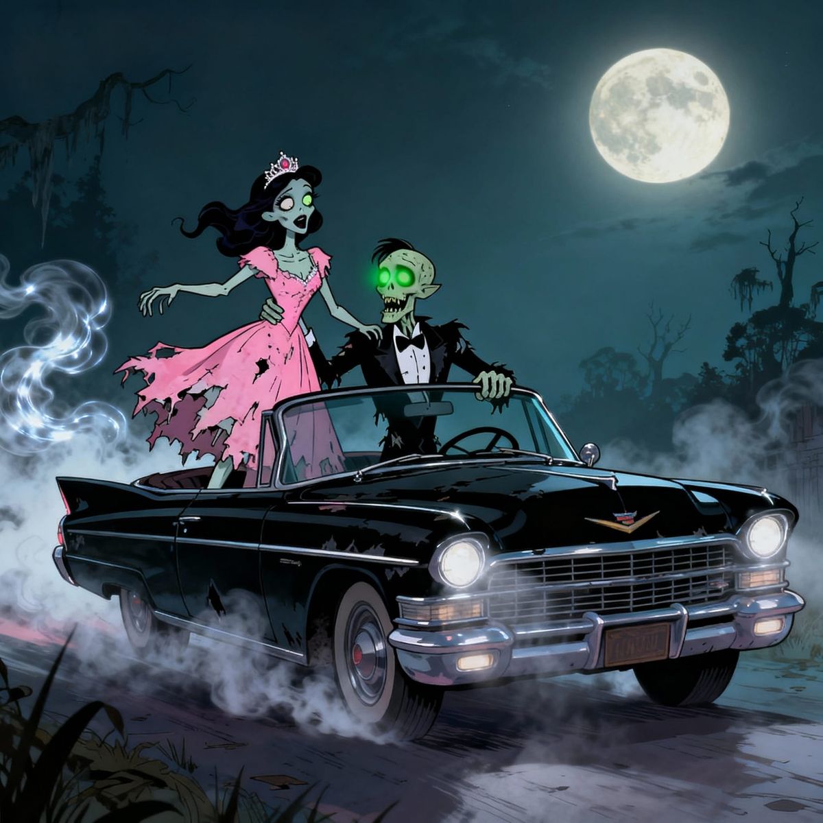 This image features a zombie couple on a nighttime drive in a vintage Cadillac. The scene is depicted in a whimsical Disney cartoon style with exaggerated features and bold outlines.
