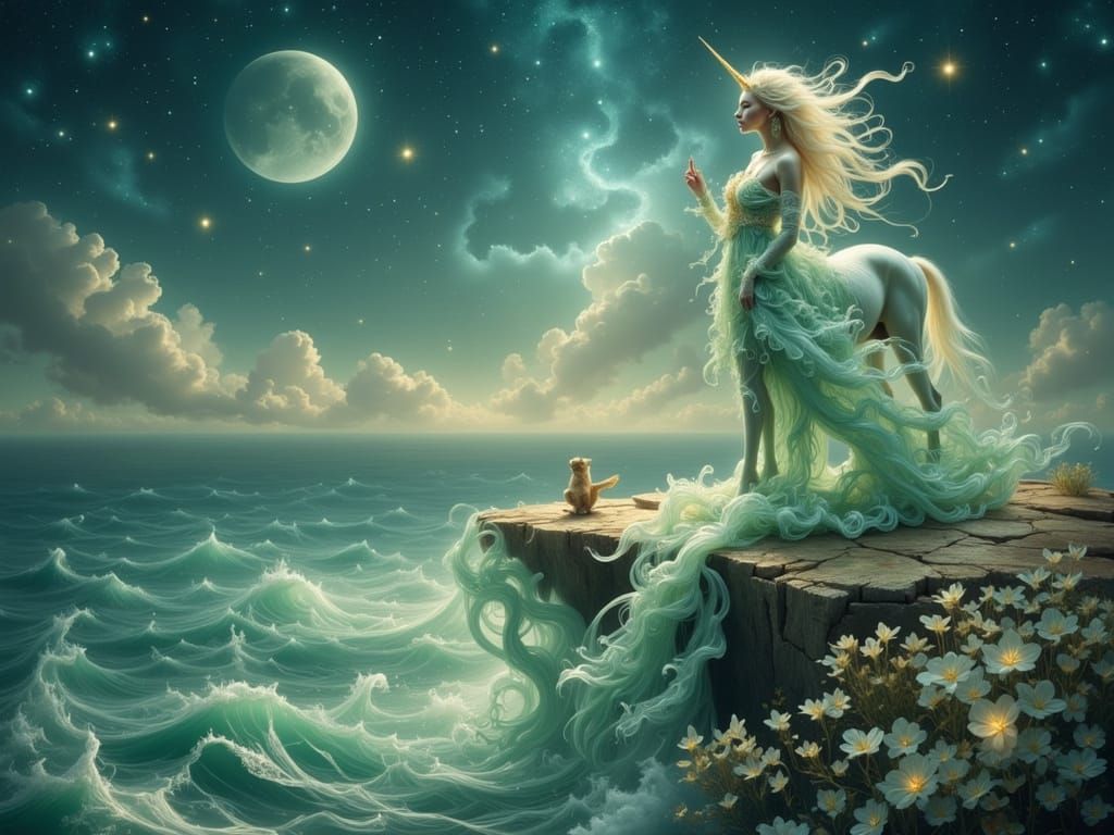 This image shows a beautiful unicorn maiden on a cliff overlooking the ocean. She wears a flowing green gown, her hands clasped in blessing, rendered with dreamy romanticism and vivid, high-fantasy detail.