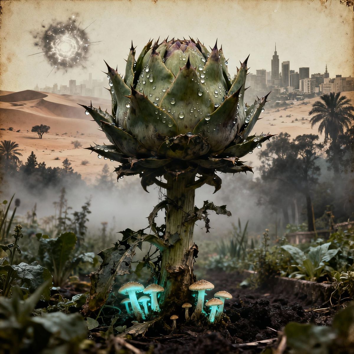 This image shows an ancient, overgrown artichoke plant in a misty garden, with bioluminescent fungi at its base. Captured with soft, diffused light, it evokes a haunting, surreal atmosphere.
