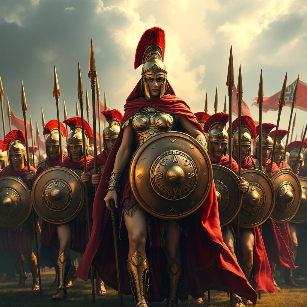 This image shows a regal Spartan queen standing proudly at the apex of a triangular phalanx formation, leading her troops into battle. The Spartans are clad in ornate bronze armor and blood red cloaks, exuding an air of intimidation and mystique. The atmosphere is charged with tension as the phalanx adva...