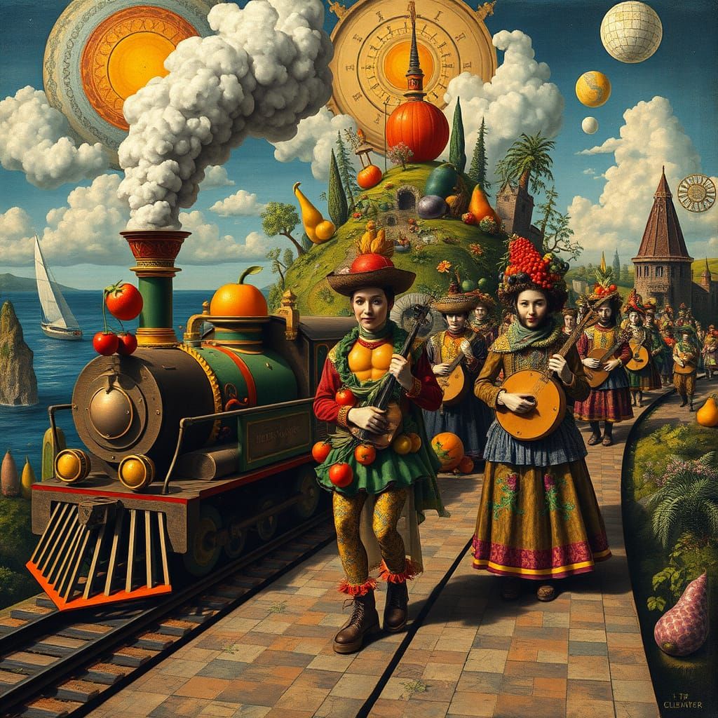 This image shows a vibrant, dreamlike island where trains strut their stuff in a fantastical parade of fruit, vegetable, and musical instrument attire, inspired by the whimsical style of Giuseppe Arcimboldo