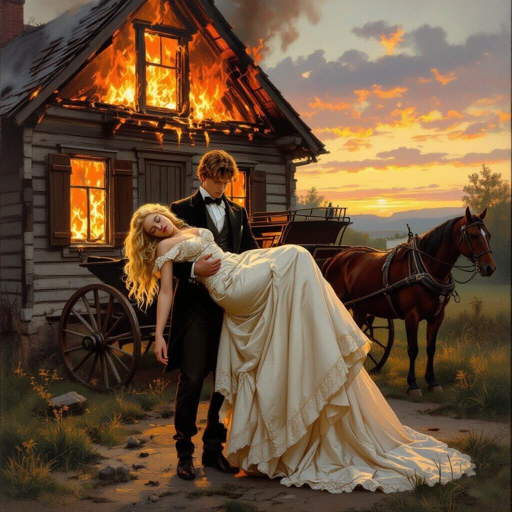 A handsome young man carries a sleeping woman in a ballgown from a burning house. A horse-drawn carriage waits as golden sunset light illuminates the dramatic scene, rendered in romantic realism with detailed brushstrokes.