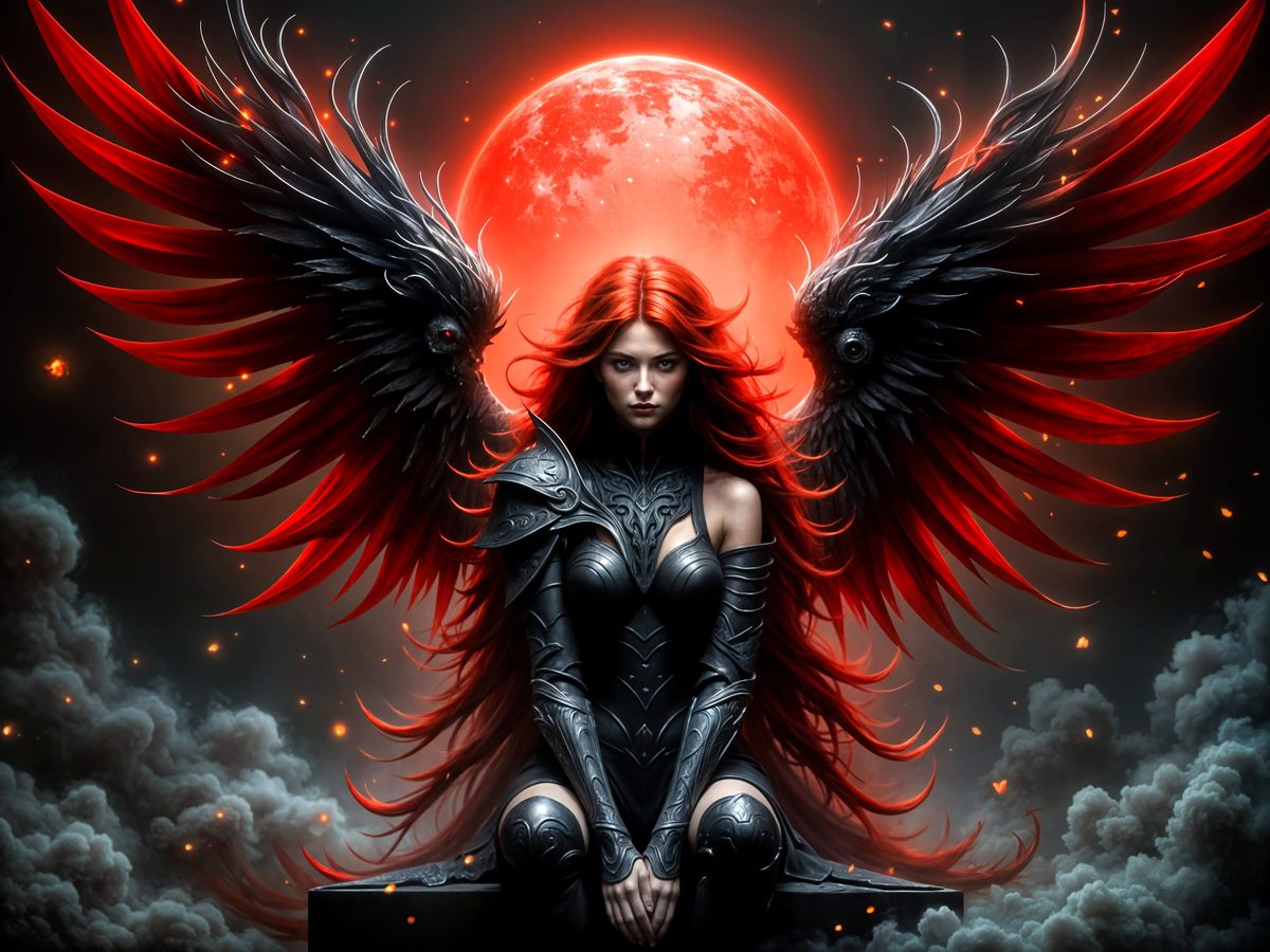 A digital oil painting of a warrior angel with red hair and wings, seated against a shadowy background. She wears detailed black armor, with a red halo resembling a moon behind her.