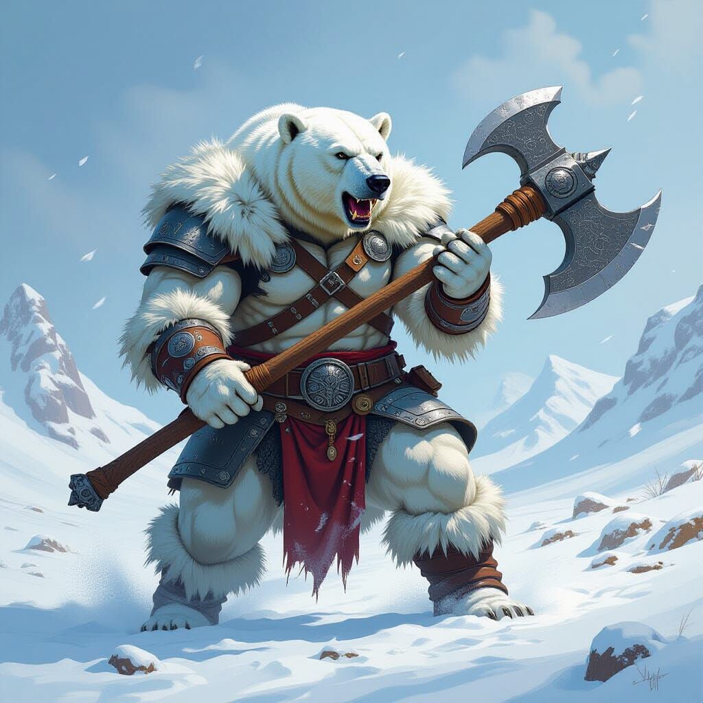 A striking picture of a polar bear barbarian in fur armor, wielding a battle axe. The snowy tundra scene is rendered with vibrant colors and intricate textures, in a fantasy art style.