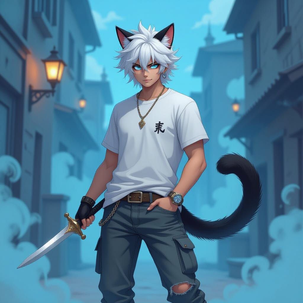 A striking picture of a tall man with cat-like features standing before a building shrouded in mist. He is casually dressed and twirling a dagger, rendered with dark, fantastical style and vibrant character design.