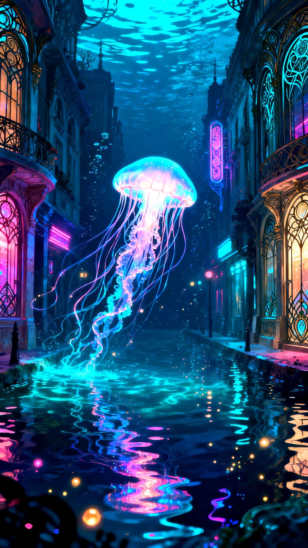 This digital painting showcases a glowing jellyfish navigating a vibrant, neon-lit underwater city with Art Nouveau architecture. Cinematic lighting emphasizes its ethereal presence.