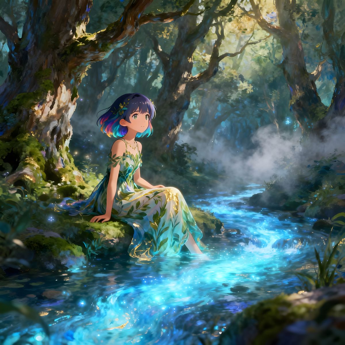 A young girl with colorful, anime-style hair sits by a luminous stream in a dense, mystical forest. Ancient trees and magical mist create a dreamy scene with soft, diffused lighting and ethereal colors.