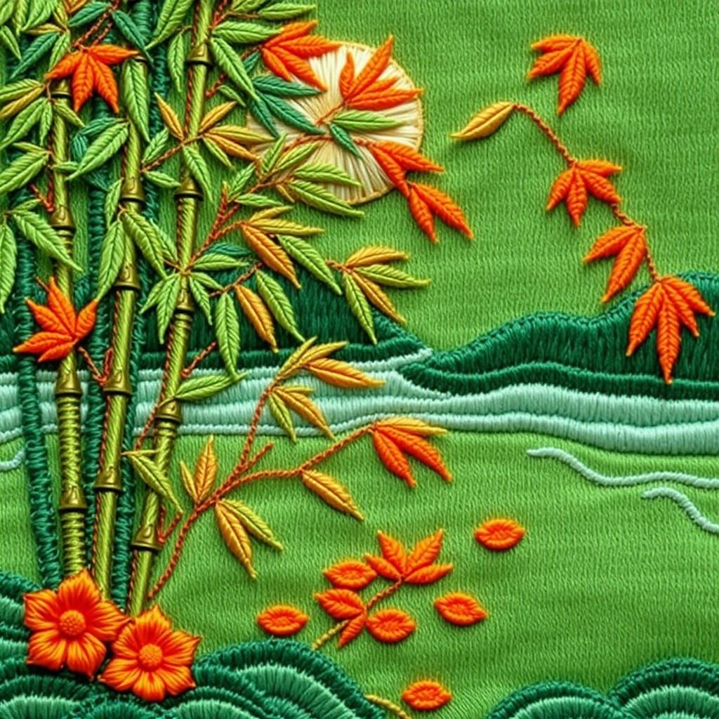 This image showcases a heavily embroidered scene of a tactile oriental bamboo lake, featuring green and orange tones in a distinct embroidery style.