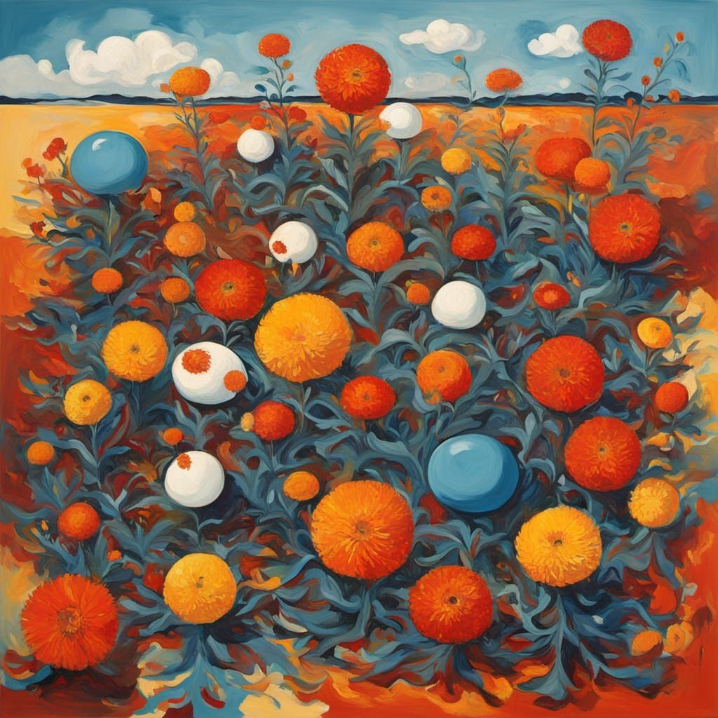 This abstract surrealist painting features a tumbleweed and marigold in an expansive, Bauhaus-inspired style with Fauvist color influences.