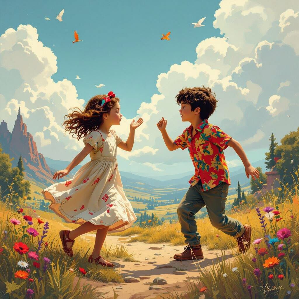 This image shows a girl in a dress and a boy in a shirt playing tag in a whimsical landscape. It's a detailed matte painting with deep, complementary colors and fantastical elements.