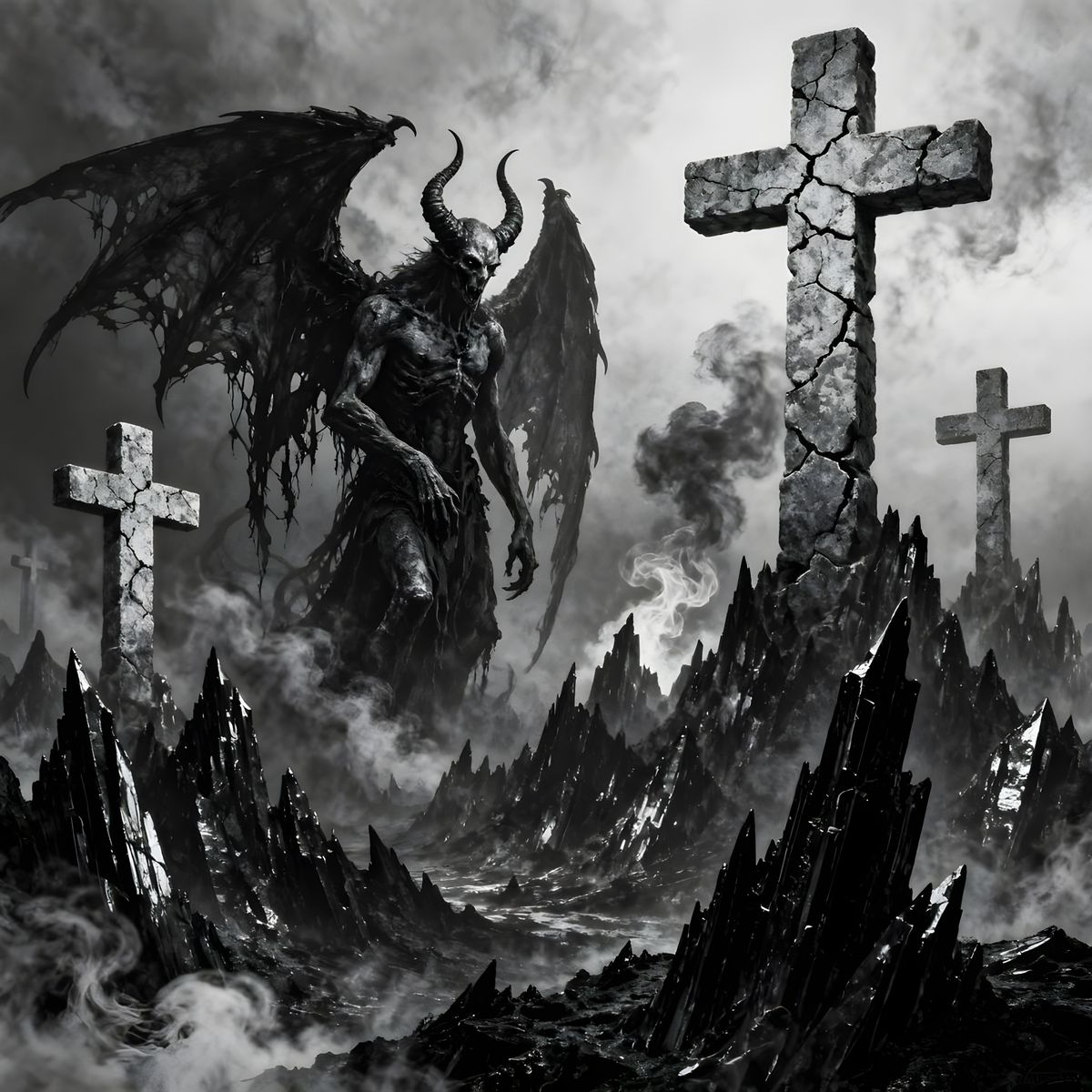 This image showcases a dark, gothic black metal album cover featuring ominous demons, hellish landscapes, and foreboding crosses in a haunting black and white palette, evoking a dark fantasy aesthetic.