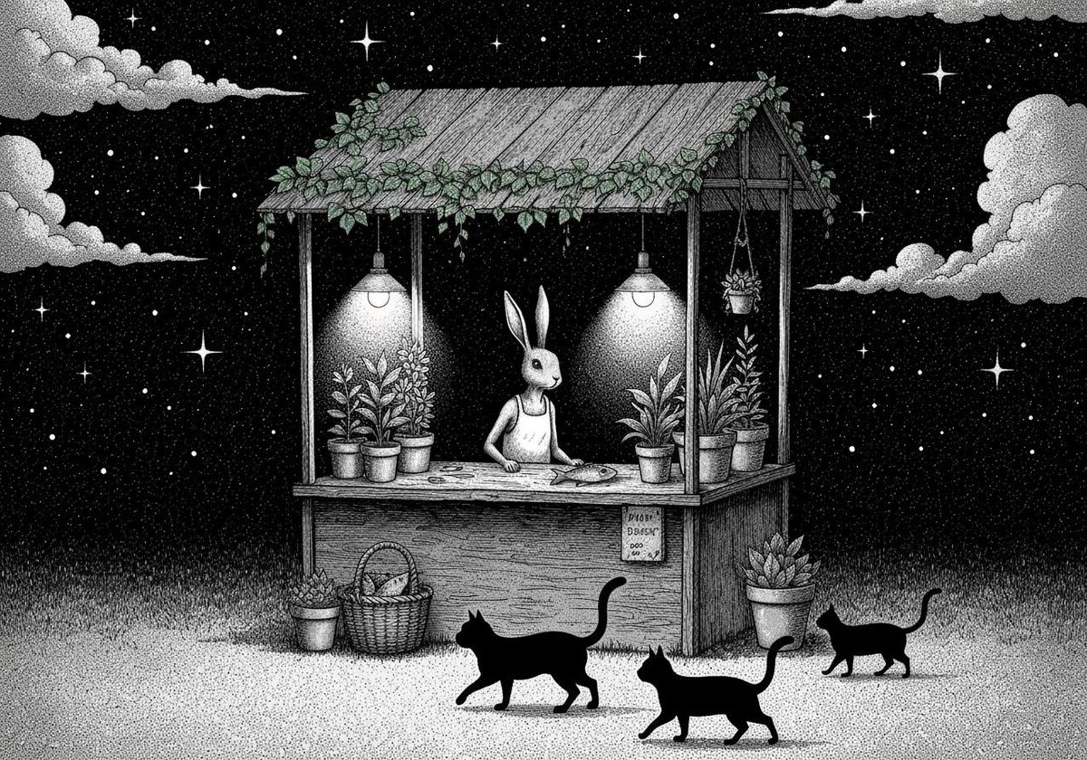 The image will be a stall; the stall's wooden roof is covered in green leaves. Surrounding it, we see some potted plants and a basket of fish, giving it a country feel. It's nighttime, and the only light in the image ...