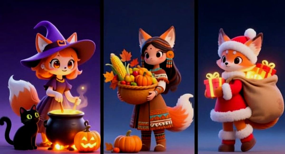 This image showcases three adorable anime-style kitsune characters celebrating Halloween, Thanksgiving, and Christmas, rendered in a vibrant 3D illustration style.