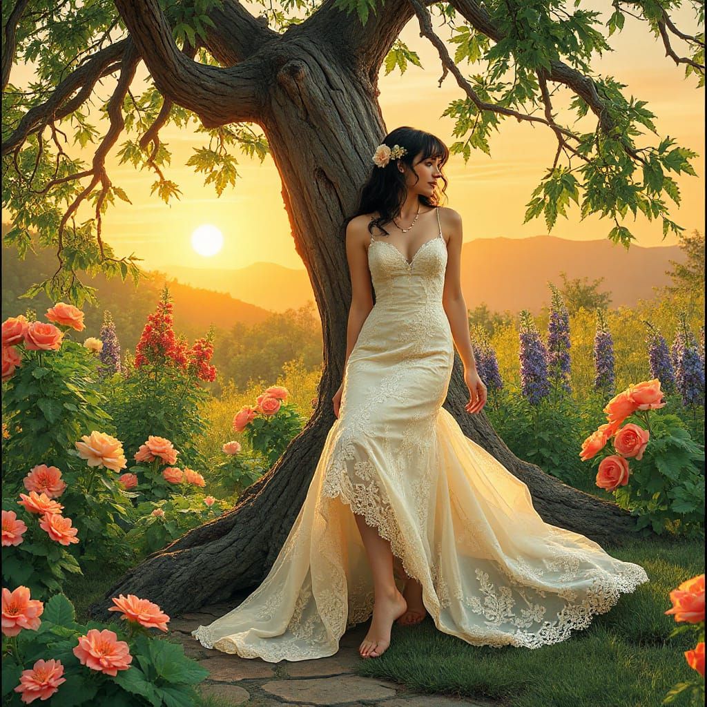 A captivating image of a woman in a flowing lace gown, set in a vibrant garden at sunset. The artwork evokes a romantic, ethereal aesthetic with illustrative linework and a soft, golden light.