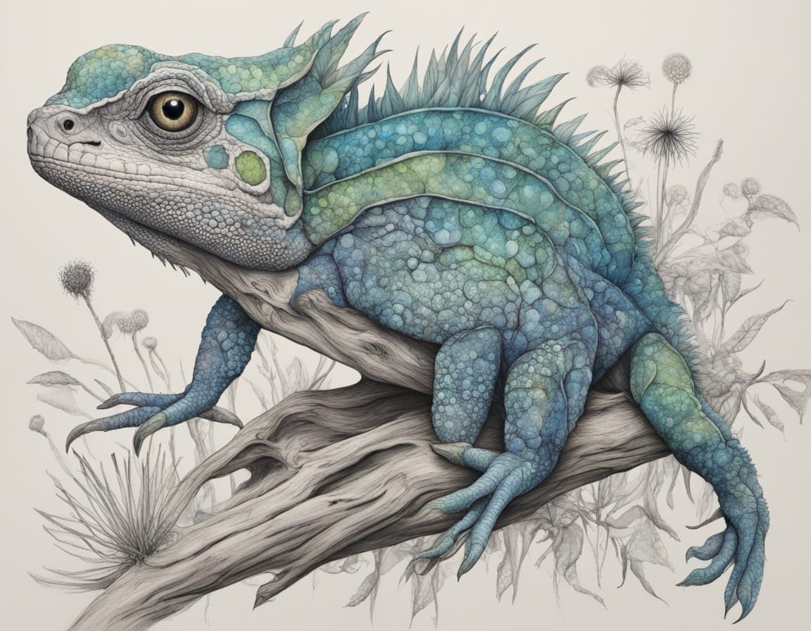 This image features a gothic pencil sketch of driftwood and an oyster, rendered in shades of blue, gray, and pastel green, evoking a unique artistic style.