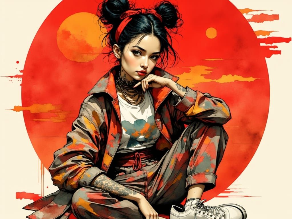 A stylish young woman with tattoos and bold makeup stands out against an abstract backdrop. This eye-catching image features vibrant colors and a unique blend of modern and traditional artistic elements.