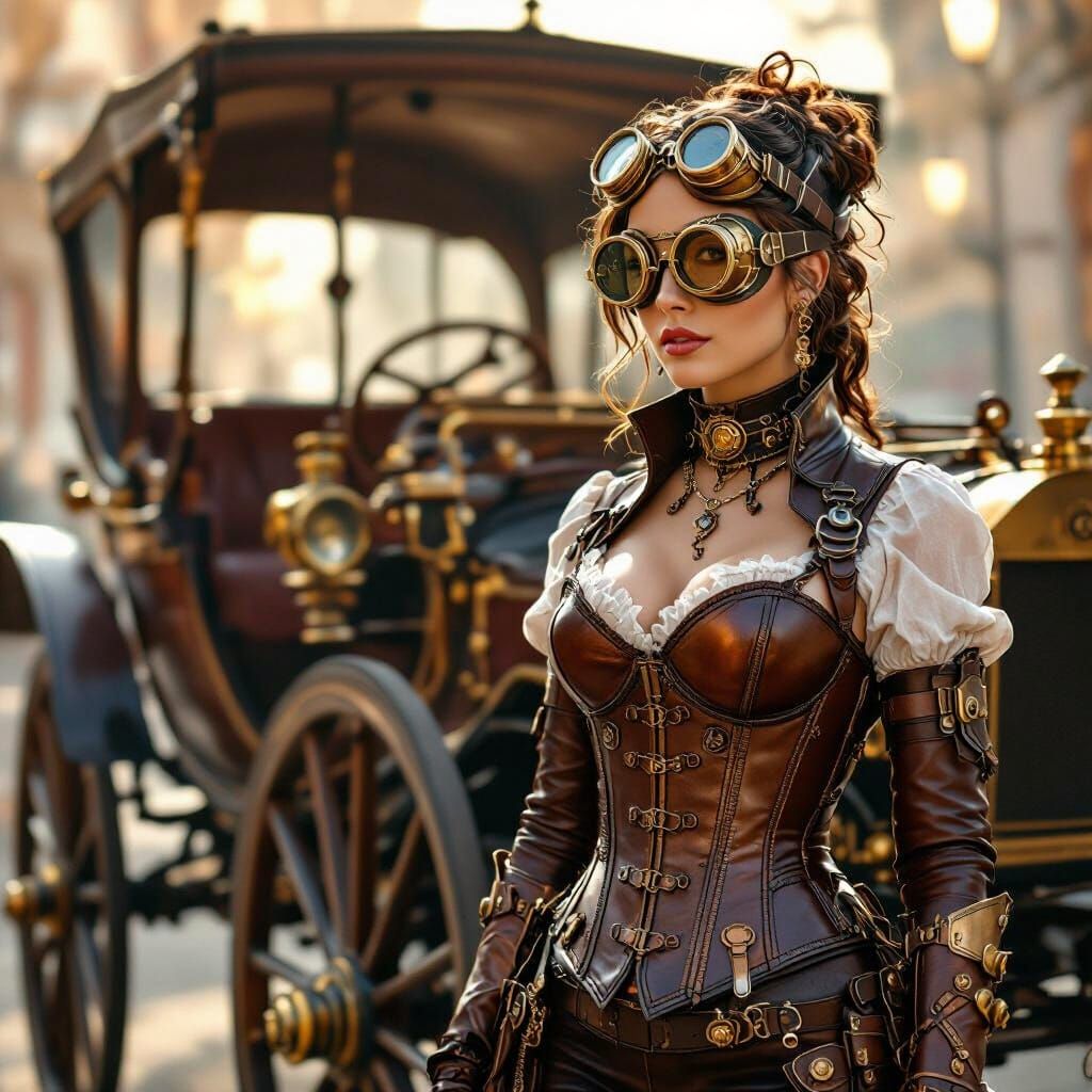 A striking picture of a woman in an elaborate steampunk outfit next to a vintage horse-drawn carriage. The image features detailed textures and warm lighting, in a retrofuturistic style.