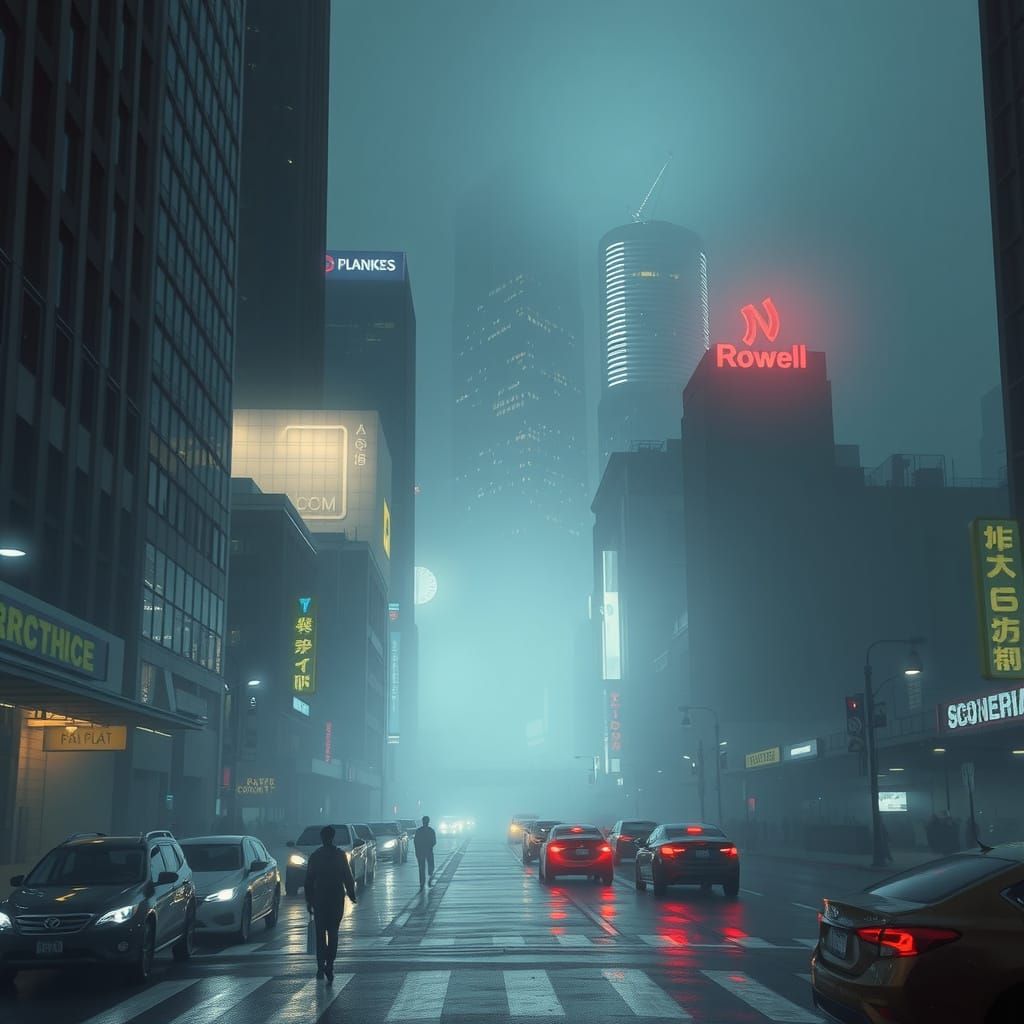 A vibrant cityscape at night, shrouded in fog and illuminated by neon reflections on slick streets. The scene evokes urban isolation with cool colors and sharp contrasts, reminiscent of cyberpunk art.