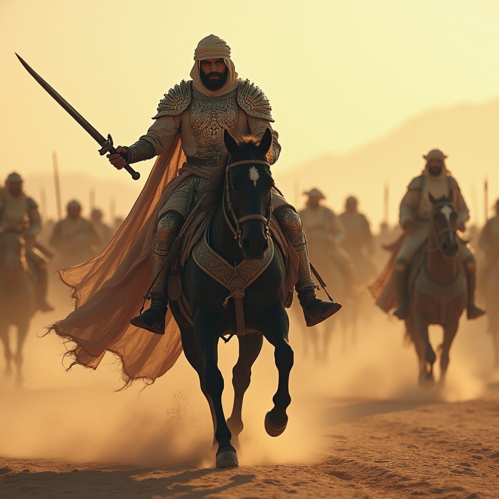 A majestic warrior in traditional battle armor rides a black Arabian horse, leading a vast army into a cinematic desert battle scene, set against a backdrop of atmospheric lighting and sprawling dunes.