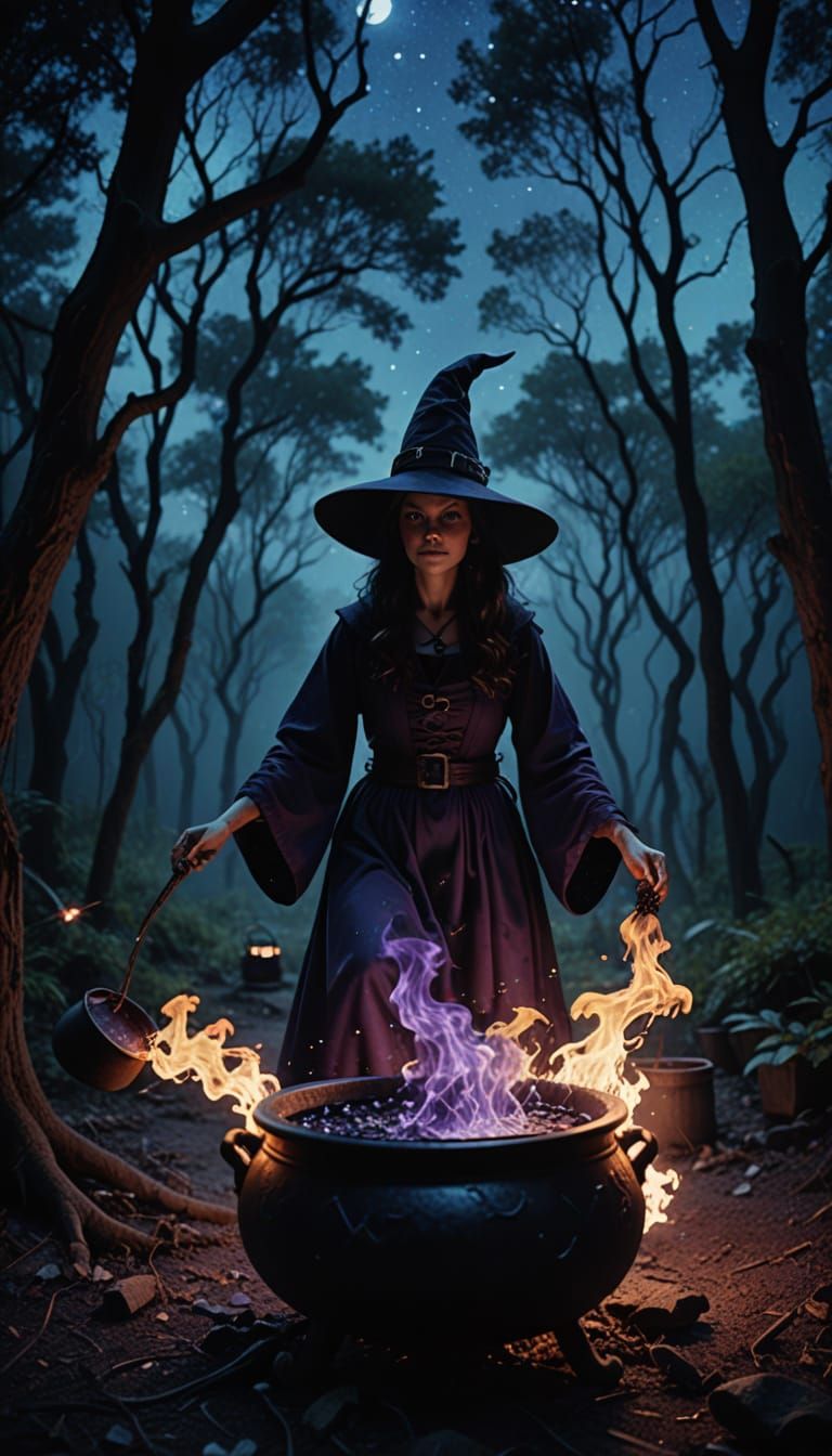 A witch's cottage at midnight, glowing pumpkins, swirling fog, black cat on a broomstick, crescent moon, twisted trees, spellbook open.Ancient stone altar in dark forest, ritual candles, magical runes glowing red, shadowy figures chanting, blood moon above, swirling leaves.Witch dancing around cauldron, ...