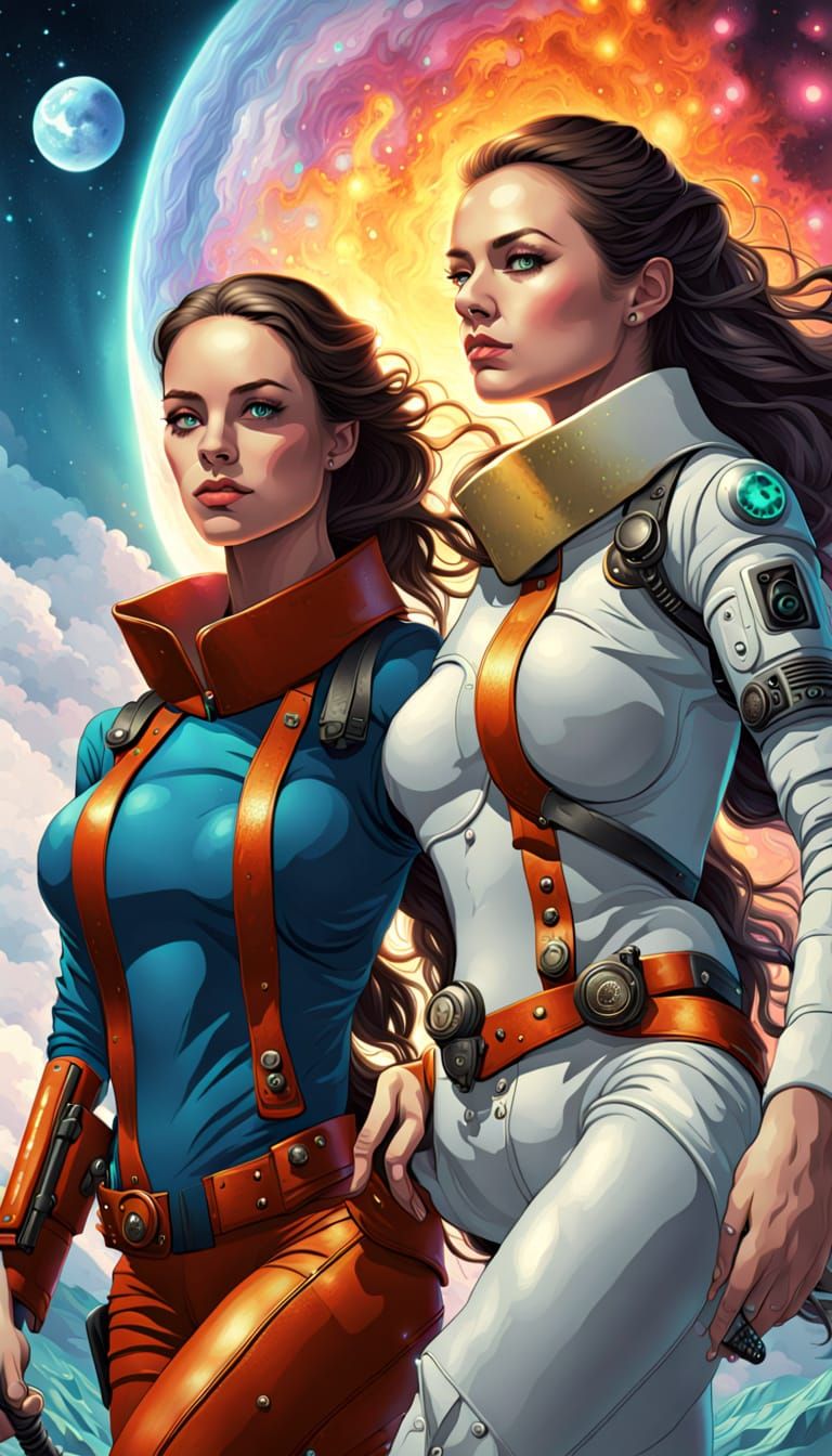 This image shows two female explorers embracing adventure on alien worlds. The vibrant, colorful scenery evokes a sense of wonder and discovery in a science fiction setting.