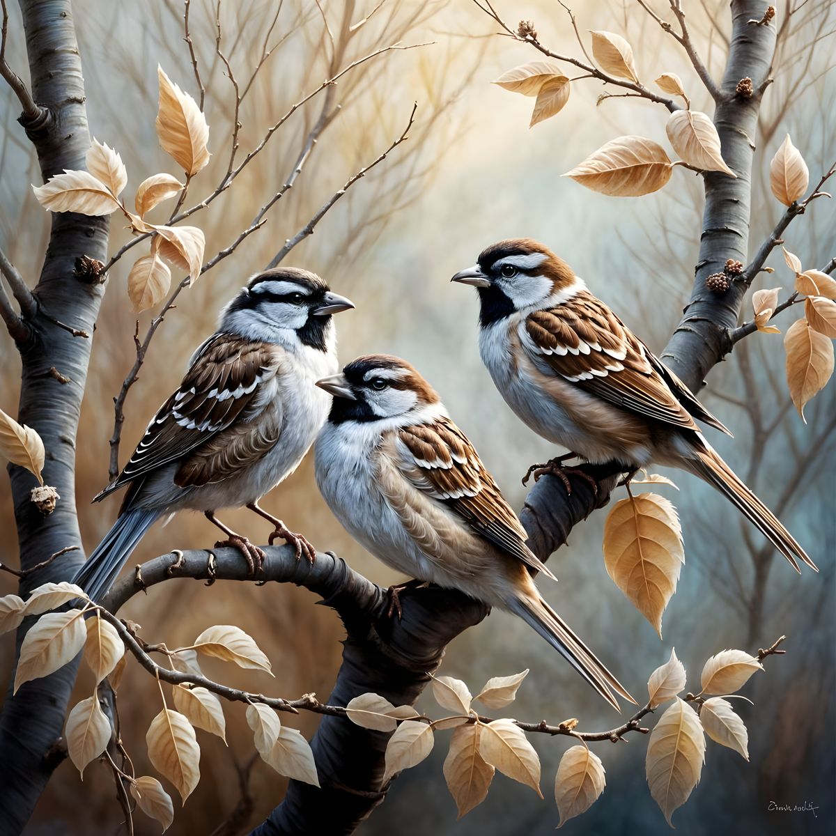 This image depicts three sparrows nestled closely together in an empty hazel bush, evoking a sense of fantasy and quiet observation.