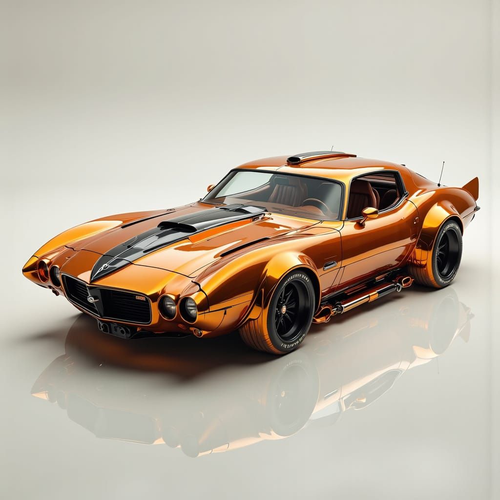 A futuristic 70's sedan concept with orange metallic paint and curved lines. Gleaming with a glossy, high-tech sheen, the design evokes retrofuturism in a digital art style.