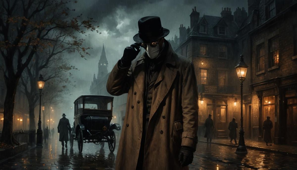A gothic illustration of the Invisible Man walking through the foggy streets of 19th-century London. This high-contrast oil painting with earthy tones captures a moody, atmospheric scene.